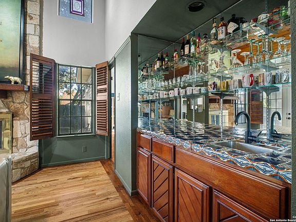**OPEN HOUSE on Sunday, October 19, 2025 from 12 pm to 2 pm** Located in the sought-after Thousand Oaks area, this lovingly maintained home radiates charm, comfort, and thoughtful craftsmanship. Inside, you'll find vaulted ceilings and expansive windows that fill the rooms with natural light. The living space features a striking stone fireplace, and to one side, a stylish bar area with mirrored accents and decorative tile that adds character and warmth. The kitchen combines style and function with stainless steel appliances, a charming bay window above the sink, beautifully repainted deep green cabinetry, and direct access to the back deck, creating an ideal setting for seamless indoor and outdoor living. Elegant vintage chandeliers, recessed lighting, and upgraded fans enhance the living spaces with a touch of sophistication. The third bedroom offers flexibility and can easily serve as a home office, creative studio, media room, or cozy reading nook. The primary suite stands out with high ceilings, private outdoor access, and an ensuite bath that feels like a retreat. It features a skylight, a statement tile shower perfect for hanging plants, and mirrored closet doors that reflect both space and light. Throughout the home, you'll find quality finishes including authentic hardwood and Saltillo tile flooring, fresh paint, and updated fixtures. The backyard offers a peaceful setting surrounded by mature trees and a privacy fence, with a newer deck that creates the perfect space to relax and enjoy the outdoors. Conveniently located just minutes from the airport with quick access to both Highway 281 and Loop 1604, this home perfectly blends style, comfort, and location in one inviting package-all with no HOA.
