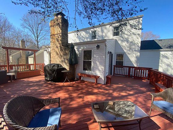 3 bdrm, 2.5 ba. 1665 sq ft home located on a quiet Cal-de-sac. Interior of home freshly professionally painted. Rooms include living room, dining room, family room w/fireplace, floor laundry room and eat-in-kitchen with 4 barstools at large Corian kitchen island. Oak kitchen cabinets with plenty of storage space, plus newer stainless steel appliances. Wood and ceramic floors on the first floor and carpeted stairs and newly carpeted bedrooms on the second floor. French doors off family room to the HUGE wraparound deck recently restained. Deck overlooks your private park-like backyard. Separate dining room and living rooms both with hardwoods floors and tons of natural light. Renovated master bathroom sits next to walk in closet. The two other bedrooms have just had carpets. This home has a 2 1/2 car garage. Smoke-free home .