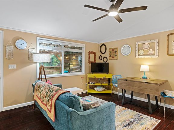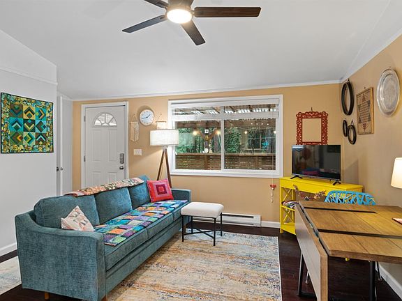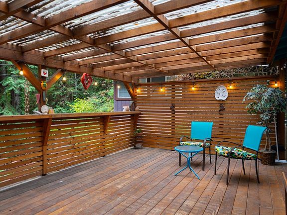Nestled among the trees yet filled with natural light, this charming one-bedroom, one-bath home sits at the edge of Rio Nido and Armstrong Valley, offering the best of both worlds. Thoughtfully designed and move-in ready, the home features a full kitchen with stainless steel appliances, shower/tub combo, washer/dryer hookups discreetly tucked into a living room closet, an entryway closet, and a spacious walk-in closet. Additional storage is available with a shed and under-house space, ensuring you'll have room for everything. The covered deck extends your living area outdoors, providing the perfect setting for year-round dining and entertaining. The terraced front garden basks in sunshine, ready for someone to bring their vision to life. Practical amenities include a connection to sewer, designated off-street parking, and peace of mind being outside the flood zone. Just minutes from Armstrong Woods State Park, the Russian River, downtown Guerneville, and a short drive to the Sonoma Coast, this home offers the perfect retreat to embrace nature and the relaxed Russian River lifestyle. This is one you don't want to miss!