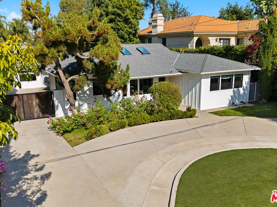 Experience the best of California living in this stunning modern farmhouse, perfectly positioned on a flat 9,700+ sq. ft. lot South of Ventura Boulevard. This single-story home masterfully blends modern luxury with warmth and functionality. A circular driveway welcomes you home, while a gated side drive leads to a beautifully finished detached garage - ideal for use as a studio, gym, or office. Inside, natural light pours into an open-concept floor plan featuring vaulted ceilings, skylights, and designer details throughout. The Chef's Kitchen is a true centerpiece with a Bertazzoni range, custom cabinetry, quartz countertops, and a generous island that encourages gathering. The primary suite boasts floor-to-ceiling closets and a newly remodeled en-suite bathroom. Both the primary bedroom and main living space open to a spacious deck with a built-in gas BBQ - perfect for effortless indoor-outdoor entertaining. The backyard feels like your own private resort, complete with a sparkling swimmer's pool with new gas-heating system, a putting green, and new turf lawn for low-maintenance enjoyment. Every element has been designed to create an inviting flow between indoor comfort and outdoor leisure. Just steps from Whole Foods, Regal Cinemas, and acclaimed dining like Mizlala, Little Izakaya by Katsuya, and Los Angeles Times' "Restaurant of the Year," Anajak Thai. An exceptional opportunity in prime Sherman Oaks with ample room for future expansion or customization.