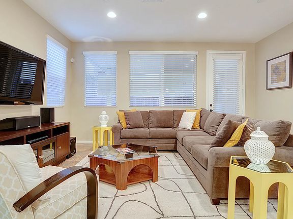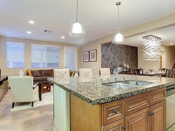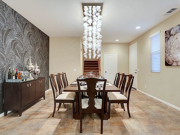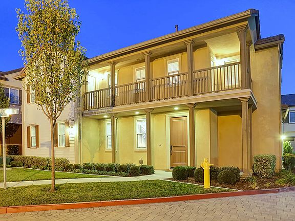 Highly desired Wyeth Cove w/beautiful upgrades, great curb appeal w/covered front porch & a true open floor plan. Cozy entry way opens to formal dining , designer wallpaper, tiled flooring & recessed lighting. Kitchen offers an oversized island w/breakfast bar, granite countertops, glass tiled backsplash, stainless steel appliances, custom cabinets w/undermount lighting & pendant lighting. Family room features subway tiled floors, recessed lighting & windows allowing for natural lighting during the day. Downstairs half bath w/pedestal sink & a framed mirror. Upstairs offers a spacious loft area (optional 4th bedroom) w/recessed lighting, access to the balcony & a laundry room. Master bedroom w/recessed lighting, ceiling fan, balcony access & a master bath. Master bath offers tiled floors, custom cabinets, separate sink vanities, shower w/glass surround, soaking tub & a walk-in closet. Two additional guest bdrms w/fresh carpeting, recessed lighting & an additional bathroom w/dual sinks. Finished two car garage w/built-in storage. Backyard w/alumawood covered patio, recessed lighting, concrete decking & side yards. Community BBQ area, grass park & gazebo. Landlord pays HOA which pays front yard landscaping.