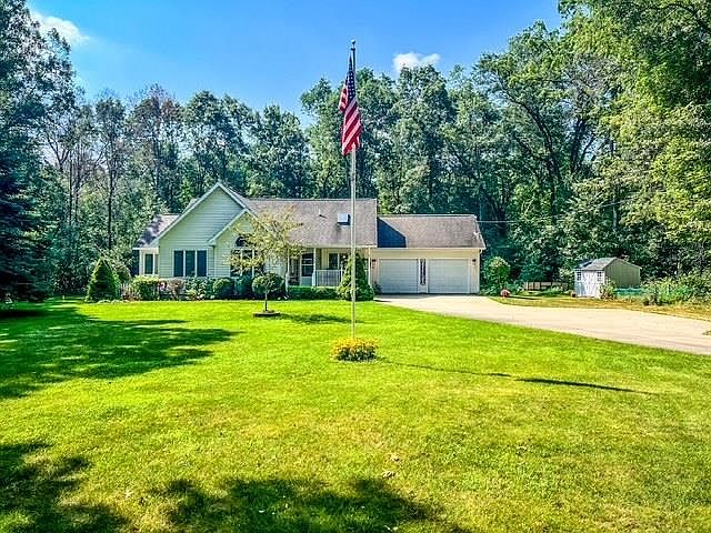Welcome to easy, one-floor living in this charming 3-bedroom, 2-bath home on 1.1 acres, perfectly set at the edge of the city limits. The well-manicured lawn, complete with an in-ground sprinkler system, frames the home beautifully, while the paved road, natural gas, and private well and septic offer comfort and convenience. Step inside to a light-filled living room with vaulted ceilings, a cozy gas fireplace, and sliding doors that lead to a sunroom—an ideal spot for morning coffee or evening relaxation. The primary suite feels like a retreat with its own vaulted ceilings, two skylights pouring in natural light, a walk-in closet, and a four-piece bath featuring an extra-deep soaking tub. Two additional bedrooms and a centrally located laundry area make daily life simple and functional. Outside, you’ll find not only a 2-car attached garage but also a large shed and a separate gardening shed—perfect for hobbies, storage, and projects. This is a home where space, comfort, and location come together, ready for you to move in and make it your own.