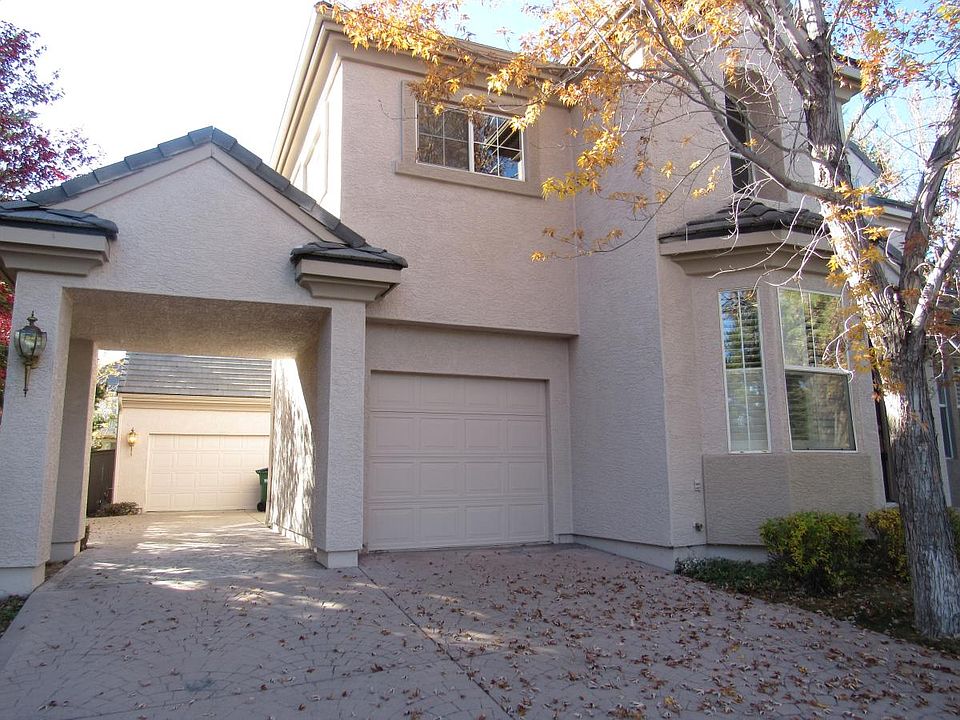 3 Bedrooms, 2.5 Bathrooms, 3 Car Garage. Rent $2,650, Deposit $2,640. 2,726 sq. ft. Includes fridge, D/W, W/D, gas range A/C and double pane windows.Pets on a case by case basis. This fabulous former model home with $50,000 worth of upgrades plus many recent improvements that is located in the gated community of Caughlin Creek at Caughlin Ranch is a rare find indeed. Some but not all of the upgrades include upgraded cherry wood cabinets and built-ins; granite counter tops; double convection ovens; a central vacuum system; surround sound; a master retreat with a sitting room, fireplace and a whirlpool bathtub plus an extra-large stamped concrete patio with pergola. Recent improvements include brand-new carpet and brand-new exterior paint that includes the pergola. The floor plan is open with the large gourmet kitchen merging as one with the large great room that has a fireplace and a large built-in upgraded cherry wood entertainment center. Other features include a dramatic entry with a 2-story high ceiling, lots of beautiful tile flooring, a beautiful den/formal office, lots of light-giving windows, a cul-de-sac location, no neighbors to the rear as the home backs up to a green belt with Deer creek flowing through it plus being conveniently located near the Caughlin Club. Last but not least is that the owner provides all landscape care. Tenant pays G, E & W. 1 year lease.