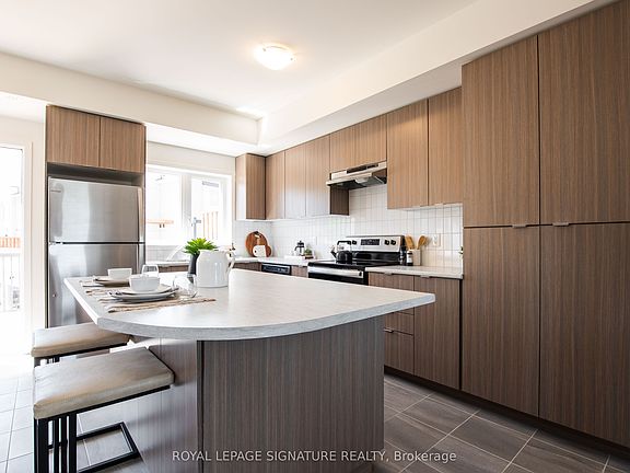 The Daniels Corp's 'First Home Pickering' - 2Br/3Wr End Unit Townhome In Central Pickering. Steps To The Pickering Town Center, And Minutes To The 401. Brilliant split BR layout, each bedroom with a full ensuite washroom and generously sized walk-in closets. Laundry on upper floor for your convenience. Unit fronts onto greenhouse a park space. One Garage (Entrance To Home) Included In Monthly Rent. **photos of a matching floor plan that was a model suite and staged - currently tenant occupied**