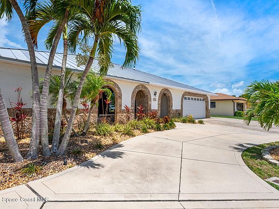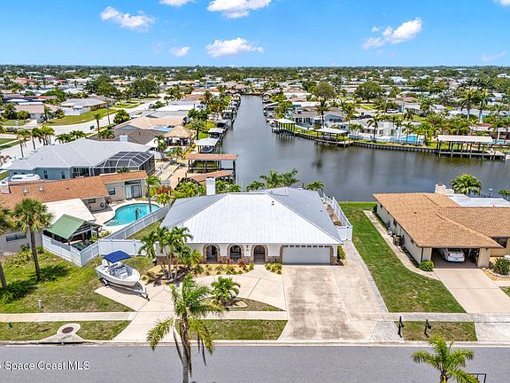 Tucked at the end of a quiet cul-de-sac at the very back of Diana Shores, this canalfront home delivers unbeatable down-the-water views, dreamy sunsets, and direct access to Sykes Creek. Set on one of the widest canals with plenty of room to turn a boat, the home is loaded with upgrades: 8 hurricane-rated windows, whole-house accordion shutters (2022), impact garage door (2023), and an 82' vinyl seawall with composite dock, jet ski lift, and kayak platform (2021). Entertain outdoors on the pavered patio, with a prewired and reinforced middle pad for a hot tub. Inside, enjoy a bright, open split floorplan with travertine and LVP flooring, a remodeled kitchen with gas range, indoor laundry, wood-burning fireplace—and no cast iron plumbing. A metal roof, newer electric panels, tankless gas water heater, privacy fencing, and high-end water filtration system round out the list. Tucked away yet close to 528 and the beach, this is where everyday comfort meets the Space Coast lifestyle.
