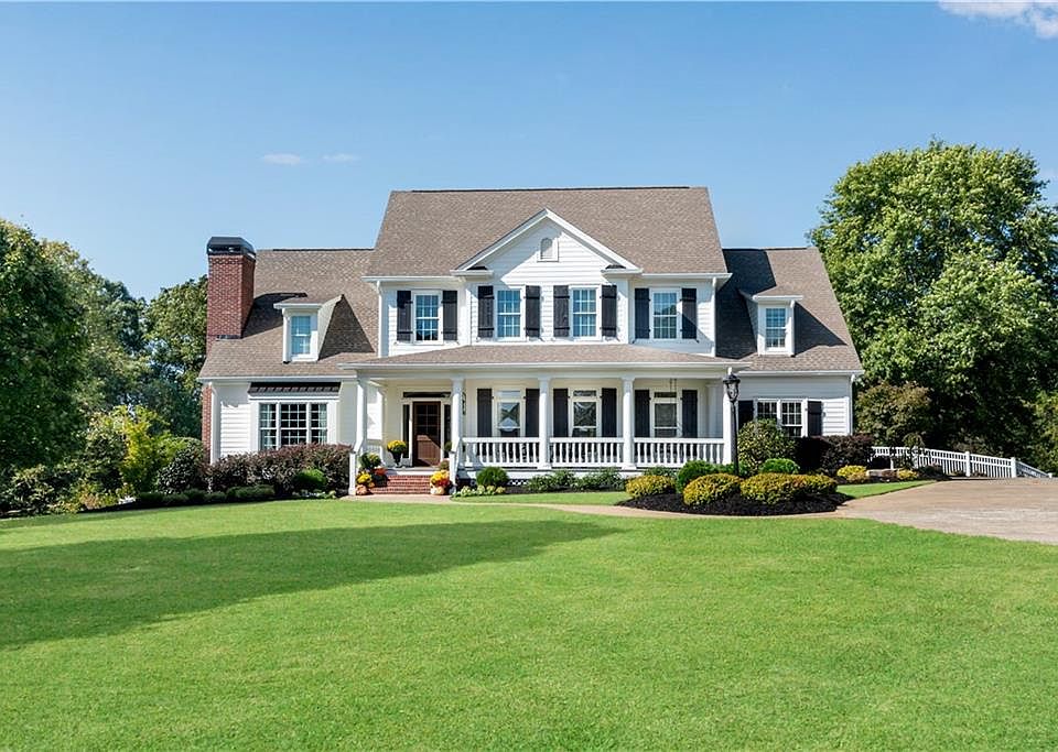 This Southern Living designed luxury estate is nestled on 12 breathtaking acres in the highly desirable Hickory Flat community. Southern charm at its finest meets luxury details and timeless elegance. From the moment you arrive, you’re greeted by a grand entrance framed by mature trees and rolling landscapes. The residence features a beautifully designed 5-bedroom, 4 1/2-bathroom home with an expansive open floor plan, hardwood floors, and custom millwork throughout. A long, driveway leads to an inviting front porch, perfect for sipping tea while watching the sunrise. Step through the front door and be welcomed by a grand two-story foyer that sets the stage for the home's exquisite design. To one side, a cozy living area with a fireplace offers a warm retreat, while a formal dining room awaits those special dinners and memorable gatherings. The soaring ceilings continue into the great room, where another inviting fireplace is artfully framed by built-in bookshelves. Adjacent to this space, an extended sunroom with brick floors leads to the screened outdoor living area where you will be captivated by a million-dollar view with spectacular sunsets overlooking a sparkling pool, tranquil water feature, and rolling fields. Flowing seamlessly from the great room, the spacious kitchen and eat-in dining area beckon with beautiful stone countertops, expansive island, custom cabinetry, and state-of-the-art appliances. A charming barn door leads to a walk-in pantry, adding a touch of rustic elegance. The main level is completed by the primary bedroom, featuring a luxurious en-suite bathroom and its own convenient laundry room. Upstairs, discover one bedroom boasting an en-suite and two additional spacious bedrooms sharing a split bathroom, complemented by another laundry room. The terrace level further enhances the home’s versatility, offering an additional area for entertainment and relaxation. This space includes a living area that opens to another screened-in spot, just steps away from the pool, and an extra bedroom with a full bath, along with unfinished space ready for your personal design vision. Whether you’re seeking a private, serene Southern estate or envision creating an equestrian retreat, this home offers endless possibilities and an unrivaled blend of comfort, style, and luxury.