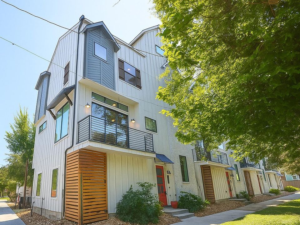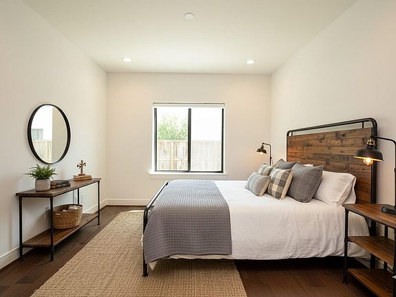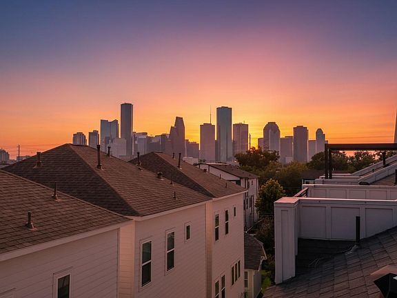 Minutes from downtown Houston, this stylish home blends contemporary design with farmhouse charm, creating a warm retreat in the city. Sunlight pours through expansive windows, highlighting tall ceilings, hardwood floor and elegant finishes. The first floor features a private guest suite with full bath and an attached two-car garage. Upstairs, an open living, dining, and chef's kitchen with quartz counters, large island, gas cooktop, and ample space to make entertaining effortless. A balcony overlooks rare green space perfect for grilling or morning coffee. The third floor offers a serene primary retreat with spa-like bath, plus a second en-suite bedroom. At the top, a loft or office opens to a terrace with skyline views, while a rooftop deck invites relaxing or entertaining. Nestled in Houston's vibrant Arts District and just minutes from the Heights, you're surrounded by galleries, coffee shops, breweries, restaurants, shopping malls and more.