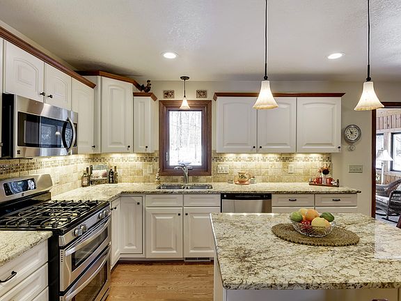Lovingly cared for, meticulous home, nestled in a private and woodsy lot. Gorgeous updated kitchen features granite countertops, stainless steel appliances, center island and more. Enjoy your 4 season porch off the kitchen year-round. Family room offers towering vaulted ceilings and Southern light exposure. Lower level offers both a cozy Den with fireplace, and entertainment room. Completely remodeled bathrooms with gorgeous tile work, custom cabinets fixtures. Hurry, this one won't last!