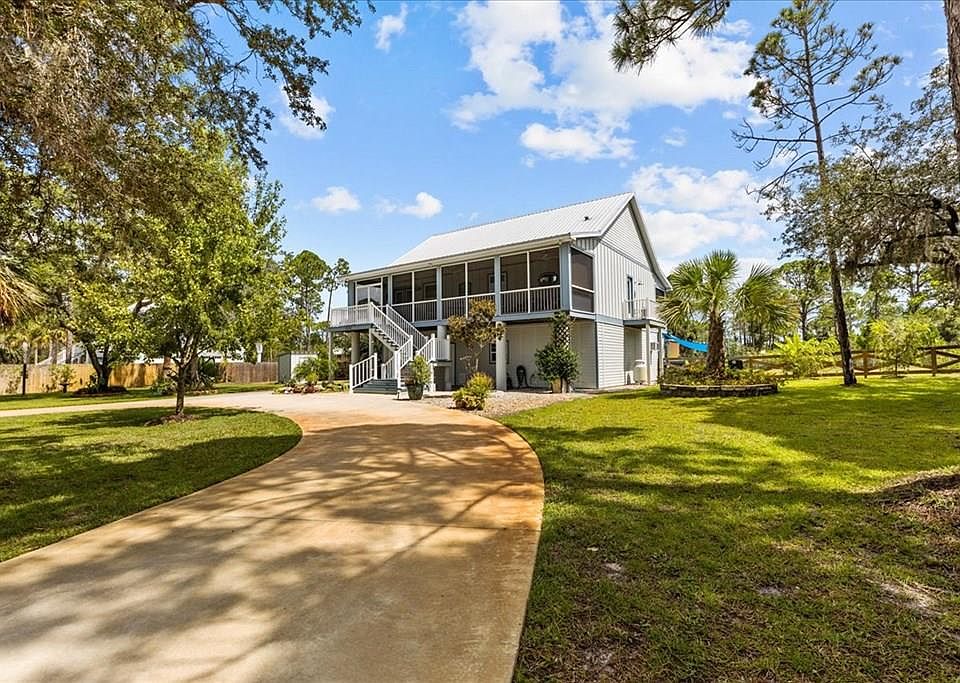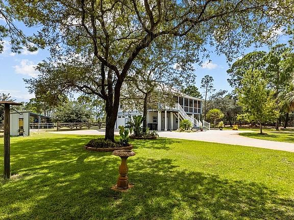 What a deal! A virtually new home you could not come close to building for this price! Welcome to your own private oasis in Cedar Key Plantation! Fully fenced back yard and mega storage for vehicle, boat, and toys. Located just off the island on higher ground, you'll enjoy all of the pleasures of island living with significantly reduced property tax and flood insurance! This house did not flood in recent storms. Virtually new condition throughout, this coastal escape is meticulously maintained. Inside you'll find high quality luxury vinyl planking floors, custom kitchen with beautiful quartz countertops, spacious pantry and stainless steel appliances. Every cook will love the gas stove and coastal vibe from the rattan pendant lighting. Kitchen island offers multi-drawer storage with a convenient and beautiful butcher block top. Every detail has been taken care of, with classic tile backsplash, quality cabinets, and a reverse osmosis system at the sink. Heading to the bedrooms split left and right of a central hallway, you'll find spacious rooms each with their own private baths. Walk in showers are custom tiled and keep a light and bright feel. Closets in both rooms feature closet systems for maximum use of storage space. At the end of the hallway are the front loader washer and dryer with easy access to both bedrooms, plus a dedicated door to the master bath. Fully screened walk around porch offers shade no matter what direction the sun is facing as well as AC unit easy maintenance. Ceiling fans front and back ensure that there is a breeze at all times! Downstairs you'll find a two car garage with high end window AC unit to keep everything cool. This is a great space for an art studio, home office, workout room, or climatized storage. Step out to the pergola covered sitting area where your plants will thrive and your guests can enjoy the fire pit and locally made seating. Pavers and umbrellas make an enticing outdoor lounging or entertaining space! Just to the side of the property is a huge plus for any homeowner--a 3 bay metal carport, an ideal spot for boat storage, lawnmower, trailer, etc. Beautiful landscaping surrounds the house, lush and tropical in nature. Fruit trees, an incredible olive tree, and so many amazing plants will grow here. Pump house offers protection from the elements and contains a hydrogen peroxide water treatment system with additional tank so you'll never run out of water. Water quality is excellent here! High speed internet so you can work from home or stream as much as you like. Come home to the Plantation, everything is ready for you!