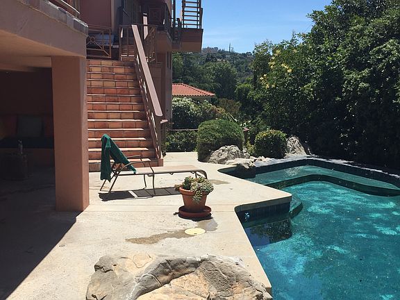 This sophisticated and stunning Spanish Villa home in the hills is built for entertaining with 6 Bedrooms (2 masters), 7 Baths with 2 spa tubs, pool with swim jets, lagoon spa, gourmet kitchen, Sub-Zero and Viking appliances, and wine cooler. Formal dining room, sauna, two laundry rooms, grotto area, family room, guest room, library, office, wine cellar, gym, basketball court, workshop, media room, music studio and French doors. 3 fireplaces, 4 car garage, deck and terraces with amazing views, high-beamed ceilings, hardwood floors, security systems and so much more!!!!