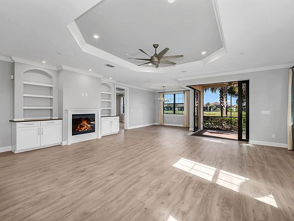 Live the resort lifestyle in this beautifully upgraded end-unit Marano model, filled with natural light and showcasing peaceful, private lake views in the highly desirable Esplanade by the Islands. Built in 2020 and enhanced with thoughtful custom upgrades, this ground-floor carriage home offers two spacious bedrooms plus a den and two-and-a-half baths, designed for modern comfort and effortless elegance. The open-concept living area features luxury plank flooring, crown molding, recessed lighting, and a custom entertainment wall with built-in cabinetry, floating shelves, and a cozy fireplace. The gourmet kitchen impresses with premium stainless steel appliances, 42-inch level 5 soft-close cabinetry, quartz countertops, upgraded backsplash and custom rollouts. A large island with recessed lighting seamlessly connects to the main living space, perfect for entertaining. Zero-corner sliders expand the living area outdoors to the screened lanai, where wide water views create a stunning backdrop. The owner's suite is a serene retreat with a tray ceiling, custom accent wall, tranquil lake views, and a spa-like bath featuring dual quartz vanities with a makeup area, a frameless walk-in shower with bench, and a large walk-in closet with custom built-ins. The private second bedroom includes its own patio and an en-suite bath with a shower/tub combination. A separate powder bath and a versatile den—ideal for a home office or study—enhance the thoughtful floor plan. Additional conveniences include impact-resistant windows and doors, and a private one-car garage. Residents of Esplanade by the Islands enjoy world-class amenities including a resort-style pool with towel service, lap pool, Bahama Bar & Grill, spa and salon, tennis and pickleball courts, fitness center, satellite community pool, outdoor barbecue area, fire pit, dog park, and the soon-to-open culinary center. Located just minutes from Marco Island's and Naples' pristine beaches and lively downtown—filled with top-tier dining, boutique shopping, and arts venues—which are just minutes away, offering the perfect blend of relaxation and sophistication.