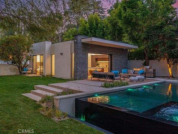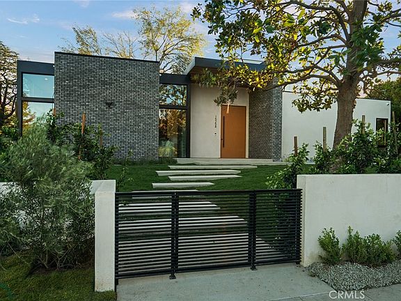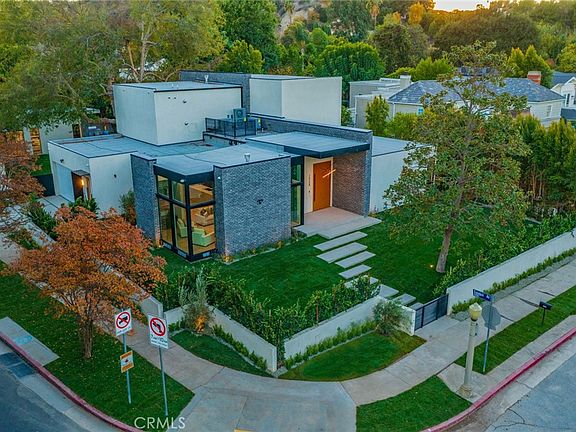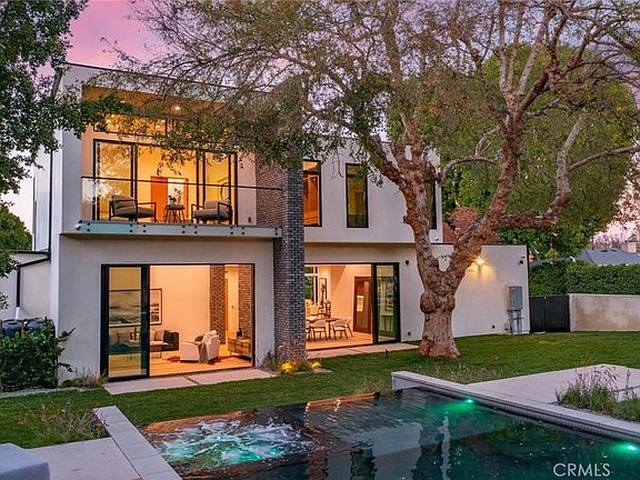 Stunning modern architectural in prime south of Ventura area. Situated on a sweeping corner lot of over 14,900 sqft, this newly constructed masterpiece offers 5BR and 6BA, including a 1BR+1BA guest house tucked in the back of the property (with its own address on Saugus Ave). Starting with the impressive curb appeal, a dramatic entry leads to an expansive formal living room with soaring 12 feet ceilings and a linear fireplace. The voluminous living room seamlessly flows to the gorgeous kitchen and breakfast area. The oversized chef’s kitchen boasts sleek custom cabinetry, a huge quartz island, 8 burner Wolf stove with double oven, Subzero fridge, built-in Wolf microwave and wine cooler. The grand open floor plan and exceedingly high ceilings continue through to the formal dining room and family room, which overlook and open to the extensive grounds. Walls of glass allow for an abundance of natural light and bring the outside in. The elegant master retreat is spacious and bright, with clerestory windows and sliders that open to a private balcony overlooking the lush grounds. The huge walk-in closet and vanity area lead to the spa-like bathroom. Sumptuous bath features an oversized walk-in shower with dual shower heads, a relaxing soaking tub, dual sinks and privacy door. Upstairs lounge area with extensive bookshelves also makes a great office. All bedrooms are ensuite, with a downstairs second master that opens to the garden. Its bathroom has a large glass shower, soaking tub and double sinks. The property opens seamlessly with multiple sliders to the entertainer’s backyard. The spacious, manicured grounds feature mature landscaping for privacy, all surrounded by lush greenery. The sparkling infinity pool has built-in spa and baja shelf, both with a waterfall edge. Patio area with BBQ wraps around the pool. Guest house with private entrance on Saugus has full kitchen with stainless steel appliances and quartz counters with center island. Living room has a wall of sliders leading out to the yard. Includes updated bath, laundry area and bedroom with its own slider. With 700 sqft the space is perfect for a home office or extended family. This property is a true oasis which fully encompasses the California indoor/outdoor lifestyle.