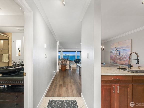Sweeping wireless view of Puget Sound and Olympic Mtns at the quiet end of beautiful Alki Beach. Watch whales, boats and winter storms, enjoy sunny days and beautiful sunsets on the covered deck, walk for miles, bike or kayak along the shore. Alki is a close knit community you will love to call home! Bayshore Condominium is a building with 25 units and has had recent building improvements: Roof replaced in 2020 decks and walkways resurfaced in 2023 (no pending special assessments) and #304 has had nearly $60K of recent upgrades. This elegant home is ADA accommodating with wide halls and doorways, low threshhold shower and maneuvering space in primary bath, laundry off hall and roomy kitchen. Gated garage and secure lobby entrance.