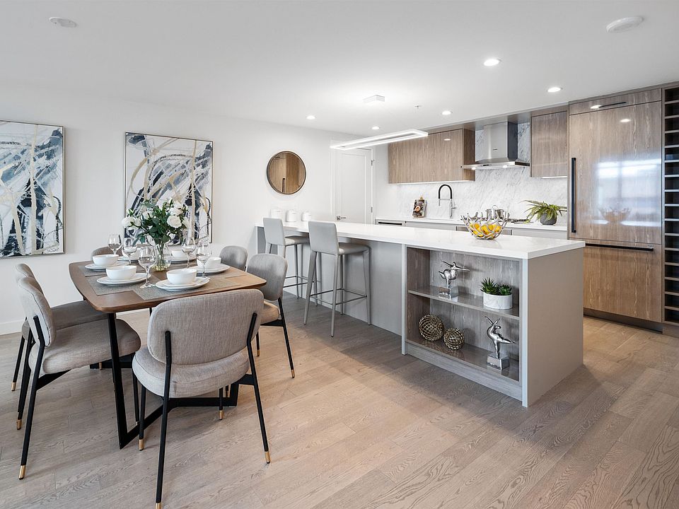 Bring your furniture! Extra large two bedroom offers plenty of room in the primary for a full bedroom suite AND features extra closet storage. The primary ensuite includes a walk-in shower and soaker tub with heated tile floors. Huge kitchen with island seating and a nearby laundry room for easy access. Enjoy sunset ocean views from your private patio. Two parking stalls, one private EV charger, storage and access to a 3000 SF multi-purpose space designed to provide lifestyle conveniences you will use every day. Walking distance to the East Beach promenade, White Rock Town Center, schools, parks and many eateries and amenities. Easy living w/Concierge on-site, safe parcel storage, and a guest suite for friends and family. Final homes remaining! Photos of 6th floor unit, same floor plan.
