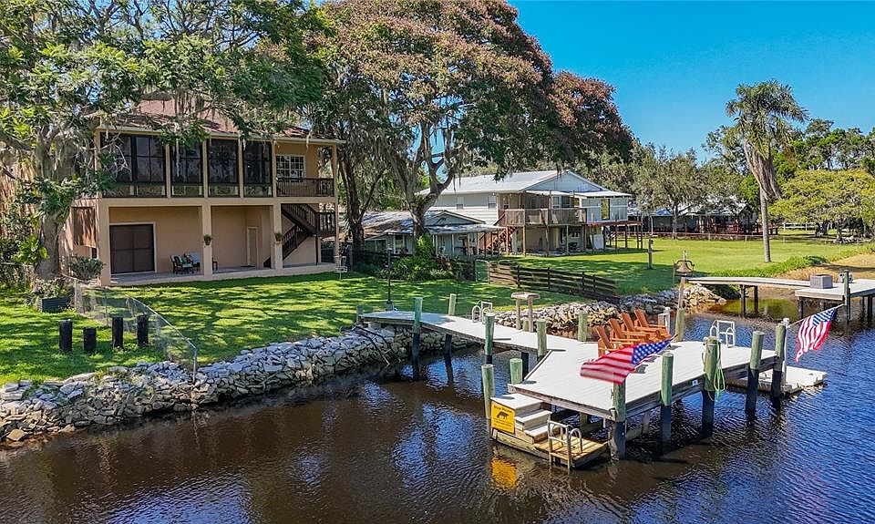 Holiday – Treetop Jewel - Welcome to Florida living at its finest. Nestled at the end of a quiet, tree-lined street, this custom riverfront home blends natural beauty with modern comforts. Shaded by mature landscaping and framed by an expansive front porch, it sets the tone for a serene retreat. Step inside and your eyes are immediately drawn to sweeping views of the tranquil 100 ft wide Anclote River and the picturesque dock beyond - expanding your living space with the beauty of the outdoors. This home has been high and dry through all of our recent storms. The heart of the home is bright and open, with soaring ceilings, recessed lighting, luxury vinyl plank flooring, and quadruple sliding doors that lead to the enclosed Florida room. Nearly every room is graced with stunning water views. The chef’s kitchen is a showstopper with solid wood cabinetry, exotic granite counters, stainless steel appliances, prep/bar sink, breakfast bar, walk-in pantry, and designer lighting. The adjoining dining space is surrounded by windows and offers seamless flow to the Florida room and living room - ideal for entertaining. The 360 sq ft Florida room is a true year-round haven (additional footage not included in living sq ft). With walls of windows, it’s the perfect place to sip your morning coffee, enjoy sunsets, or watch native wildlife pass by. The private Primary Suite offers a tranquil escape with a cozy sitting area overlooking the water, his and hers walk-in closets, and a spa-inspired en suite bath featuring a dual-sink granite vanity, custom tiled shower with dual heads, water closet, and oversized linen closet. Spacious secondary bedrooms with walk-in closets share a well-appointed guest bath. Interior stairs lead down to an expansive 5+ car garage with soaring ceilings - perfect for RVs, boats, or watercraft. Thoughtfully designed with washout walls, built-in storage, a full bath, and a rear garage stall with a garage door and retractable screen, it offers both convenience and flexibility. Out back, the composite dock is ready for adventure - equipped with a floating jet ski dock, kayak launch, multiple ladders, water and electric hookups, plus a fish cleaning station. The generous green space has plenty of room to create your dream pool and outdoor oasis. Located minutes from the famous Tarpon Springs Sponge Docks, pristine Gulf beaches, and local parks, this home offers the best of Florida’s coastal lifestyle while remaining close to shopping, dining, and entertainment. Built in 2006 to the new 2002 codes with concrete block construction and elevated electrical. Roof 2022, HVAC 2017. Come see this Treetop Jewel for yourself - You’ll fall in love the moment you arrive.