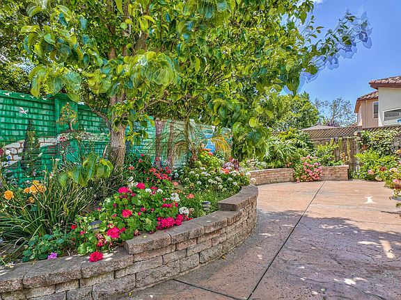 upgraded Samsung stainless steel appliances: dishwasher, microwave hood, gas convection range. A floral paradise awaits in the low maintenance enchanted garden: stamped concrete patio with raised stone planter beds, various fruit trees and tomato plants. Property also includes a shed and enclosed "CATIO" or dog kennel with pet door into house. Installed security camera system, huge storage cabinets in the garage make for an easy conversion.