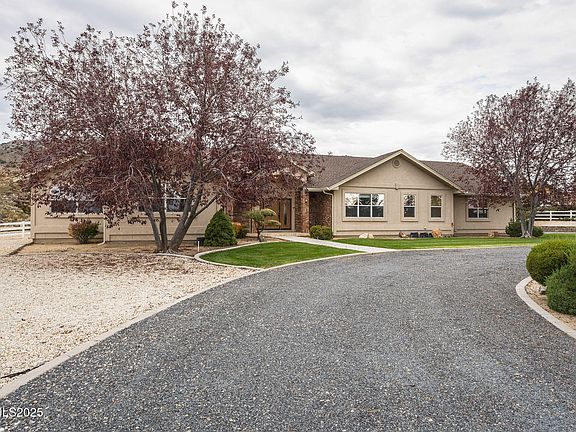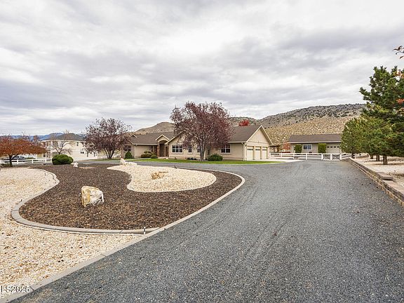 This beautifully maintained property offers the perfect combination of space, privacy, and scenic views on just over an acre. Located at the end of a cul-de-sac and backing directly to open BLM land, it provides room to breathe with no backyard neighbors and peaceful surroundings. This single-level home spans 3,246 square feet with an open, light-filled floor plan designed for comfortable everyday living. A warm and inviting great room features vaulted, beamed ceilings, a floor-to-ceiling window wall, and a gas fireplace with a brick hearth. Hardwood flooring adds timeless character while large picture windows showcase the mountain views. The kitchen is designed for both gathering and function, offering generous counter space with natural stone surfaces, a large island with cooktop, and a bright breakfast area surrounded by windows. The layout flows seamlessly into the living and dining spaces, and a separate family room provides additional space to relax or entertain. The primary suite offers a peaceful retreat with a large window framing the views, a soaking tub, dual vanities, and a walk-in shower. Two additional bedrooms are generously sized, offering flexibility for guests or office use. Outdoor living is easy with a covered patio, open views, and space to enjoy the Nevada landscape. The attached oversized three-car garage provides ample storage, while the detached workshop can accommodate two additional vehicles and is currently set up as a woodworking shop. There's also plenty of room for RV parking, and with no HOA, you'll enjoy the freedom to truly make the property your own. Built in 2000, this home combines quality craftsmanship, thoughtful design, and an exceptional setting with direct access to nature and panoramic mountain views.