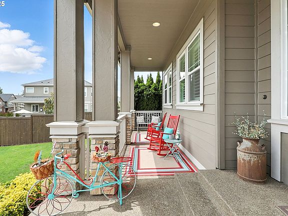 Located at the Top of River Terrace on Bull Mountain! This stunning home offers nearly 4,000 square feet of thoughtfully designed living space on one of the largest lots in the neighborhood—approximately a quarter acre—providing plenty of room to relax, play, and entertain both indoors and out. From the charming covered entry to the beautifully upgraded interior, this home has it all. The great room layout is perfect for gathering, with a spacious kitchen at the heart of the home featuring a massive island, gleaming quartz countertops, under carriage lighting, soft-close cabinetry, and a walk-in pantry. Dine at the eat-bar or host memorable celebrations in the oversized dining room meant for a dozen, complete with elegant wainscoting and a box beam ceiling. Office on the main and plantations shutters throughout the home. Upstairs, the primary suite is a peaceful retreat with crown molding, a large walk-in closet, and a luxurious bath featuring dual sinks, a soaking tub, and a floor-to-ceiling tiled shower. French doors open to a generous bonus room or guestroom, ideal for movies, homework, or creative space. Three additional bedrooms One is plumbed for a bath and potential ensuite, adding flexibility for every lifestyle. Upper laundry room includes built in sink and cabinets. Enjoy year-round outdoor living under the covered patio, outdoor gas fire pit, extended patio, surrounded by mature landscaping. The home also features a three-car tandem garage plenty for storage or workshop. Forced air cooling and 2 tankless water heaters. River Terrace is a desirable community with neighborhood park and easy access to Progress Ridge, Murray Hill, Washington Square and Hwy 99, shopping, schools, parks, and dining—this home is where everyday comfort meets elevated living.