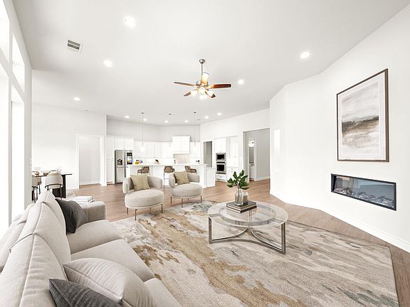 1½-story home features large entry with 12' ceilings that extend past open dining room with 12' ceilings and leads to the family room with 12' ceilings, electric fireplace, and full wall of windows. Open kitchen overlooks the large family room and breakfast room and features 42" cabinets and an oversized island with high-bar seating. Master bath includes a freestanding tub, separate shower and His and Hers vanities. Upstairs game room, theater room, bedroom, and bathroom. Oversized 33' wide patio overlooks the backyard.