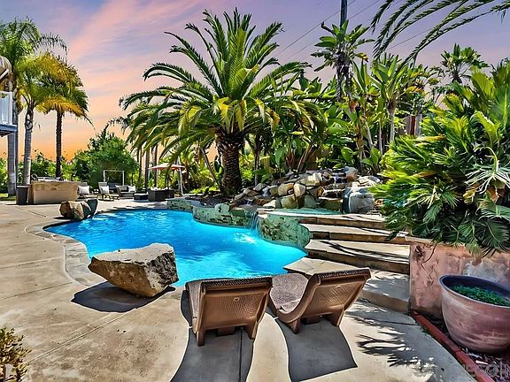 Beautiful 2-story, 5-bedroom home on a generous 1+ acre lot in the coveted Del Poniente Estates. Situated on a cul-de-sac and set back from the street, the property has park-like landscaping and unparalleled privacy. The home features an open floor plan, 1st floor bedroom and full bathroom, vaulted ceilings, quartz and granite countertops, and three fireplaces. The backyard is a peaceful and beautiful oasis with a pool, water feature, and spa ideal for relaxing and entertaining. The recent pool resurfacing and new stonework around the pool add a touch of elegance. There’s potential for an ADU/granny flat too. This property boasts owned solar, a newer roof, newer furnace and AC system, a newer water heater, and whole house fan offering both energy efficiency and peace of mind. Conveniently located just steps away from horse/walking trails, this home offers a lifestyle of tranquility and outdoor enjoyment. So many fruit trees to enjoy including blackberry, passion fruit, plumb, orange, peach, cherry, apple, pear, and avocado. Walking distance from Twin Peaks Middle School and Poway High School and part of the award winning Poway Unified School District. No HOA fees or Mello Roos.