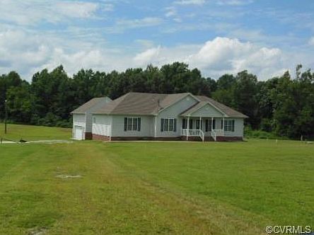 located in Prince George County with a Spring Grove mailing address - this custom built 3 bedroom 2 full bath rancher built in 2004 features approximately 1944 square feet of living space, beautiful hardwood floors and carpet, open floor plan, master suite on one side of house - split plan - family room with cathedral ceilings and hardwood floors, gas log fireplace, eat in kitchen with all appliances; huge pantry, laundry room, formal dining room with chair rail could also serve as either a formal living room or a media room; master bedroom suite has a double vanity sink, garden tub and separate shower and walk in closet. All bedrooms have walk in closets. There is a two car attached garage with auto openers, rear deck off of family room; sits on 5 acres and is horse pasture friendly