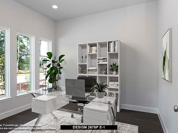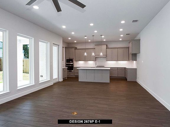 Step off the front porch into an extended entryway boasting 12-foot rotunda ceilings. French doors open into a private home office with three large windows. Down the hall you will pass a guest suite that features a full bathroom and oversized walk-in closet. The open family room features a wood mantel fireplace, wall of windows and extended ceilings. The dining area flows into the kitchen which boasts ample counter space, an island with built-in seating and a walk-in pantry. The primary suite features three large windows. The primary bathroom boasts dual vanities, a garden tub, separate glass enclosed shower, a linen closet, and two walk-in closets. Secondary bedrooms feature walk-in closets, linen closets, a full bathroom, and easy access to the utility room. Extended covered backyard patio. Mud room and storage closet off the three-car garage.
