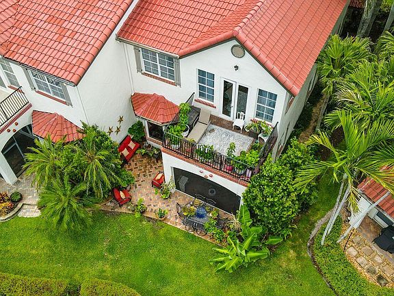 This upgraded Magellan model townhome offers 2,900 sqft with lake and Intracoastal views. It features professionally landscaped exteriors, paved driveways, and a motorized screened-in porch. Inside, find wood flooring, 10-ft ceilings, and an open floor plan centered around a chef's kitchen with quartzite countertops, stone accent wall, induction range, and recent appliances. A custom bar with wine fridge enhances entertaining. The home includes three bedrooms, an upstairs laundry room, and a large closet for elevator installation. The primary suite offers his-and-hers bathrooms, a private balcony, and a secondary patio. Pet-friendly neighborhood. Additional features include two A/C units, a new marble bathroom, impact windows, newer roof, and full home security.