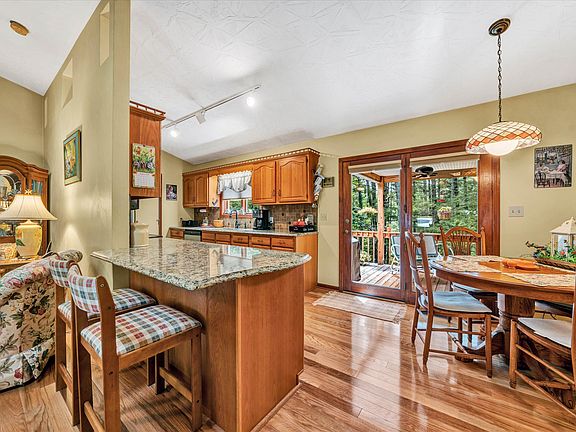 Stone fireplacePrivate bathFinished work roomNatural woodworkStainless appliancesGranite countertopsWaterside covered patio