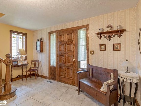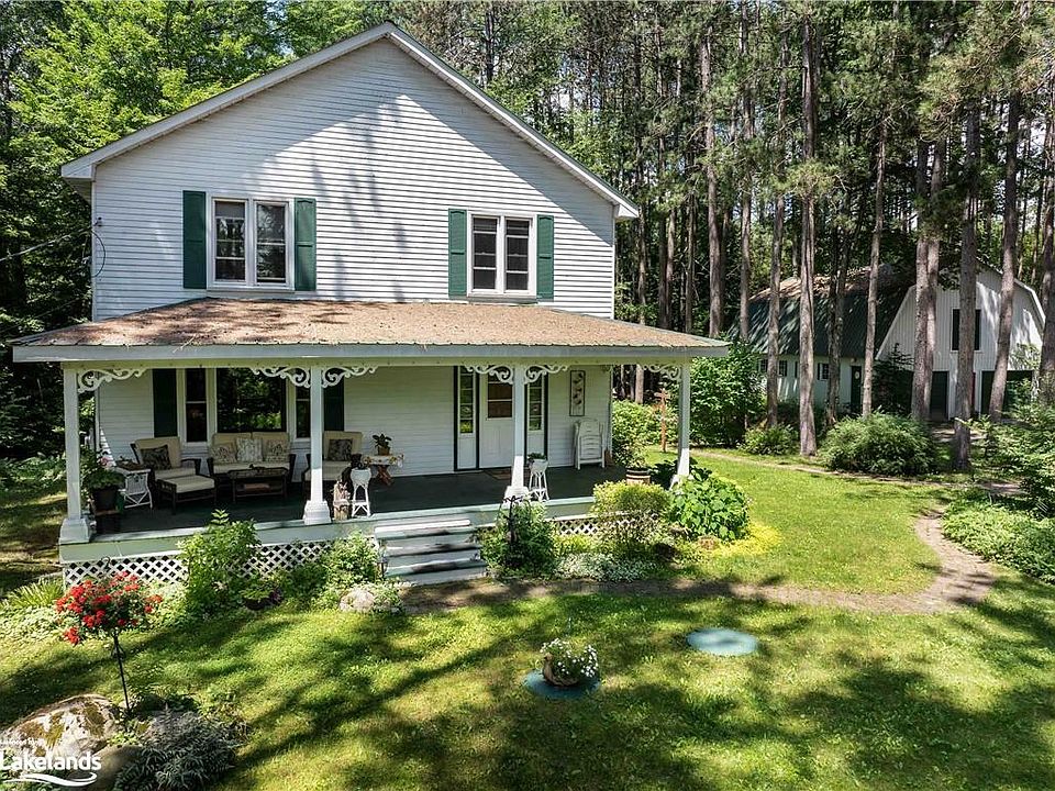 Nestled among towering pines on a tranquil country road, this meticulously maintained 3-bedroom, 1.5-bathroom family home offers over 2,700 square feet of living space across three finished levels. Situated on a picturesque 24+ acre parcel, the property features an expansive 28 x 48' garage. A spacious veranda welcomes you into the foyer of this charming home. To your left, the open-concept living and dining room showcases beautiful cork floors, while straight ahead, the generous kitchen boasts a large island and wood cupboards. A walkout from the kitchen leads to a large screened-in porch, perfect for enjoying morning coffee or evening reads. Completing this level is a conveniently located powder room for guests. Upstairs, the second level features two generously sized guest bedrooms, a large 4-piece bathroom, and an impressive primary suite. This serene retreat includes a separate sitting area or nursery and built in shelving, perfect for your private reading nook. The fully finished lower level offers an open-concept recreation room and bar area with a walkout to a private patio, complete with a hot tub and sitting area overlooking the backyard. This level also includes a spacious laundry room, a utility area with a newer propane forced-air furnace, propane hot water heater, and additional storage space. Outside, beautiful gardens and pathways surround this classic home, complete with a fire pit and over 24 acres to explore. The oversized garage accommodates up to four cars on the main level and includes a loft above, perfect for a workshop or extra storage space. Centrally located between Haliburton Village and Minden, this private home is just a 15-minute drive to either town centre, offering easy access to local amenities, including restaurants, shops, parks, and more. Schedule your viewing today!