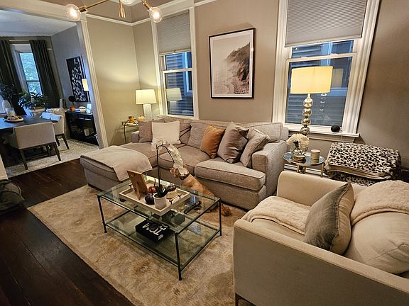 WoW! Finally available. Spacious West Lakeview 4 bedroom/2 bath Duplex down + guest room/5th bedroom/office, this Layout can accommodate lots of lifestyles/options. Large, Eat-in Stainless Appliance Kitchen is being redone with new Kitchen cupboards and Counters, (expected finished Dec 15 of 2025) and Featuring a formal dining room, laundry on lower level and ample closet space. Hardwood floors on first floor, carpet on lower level. Newer Bath fixtures, window shades and recently painted in soft neutral colors. Small deck in back with yard and 1 garage spot included, small pets allowed with extra security deposit. Quiet block on Wellington with access to Ashland, Southport Corridor, Roscoe Village, Lakeview and public transportation.
