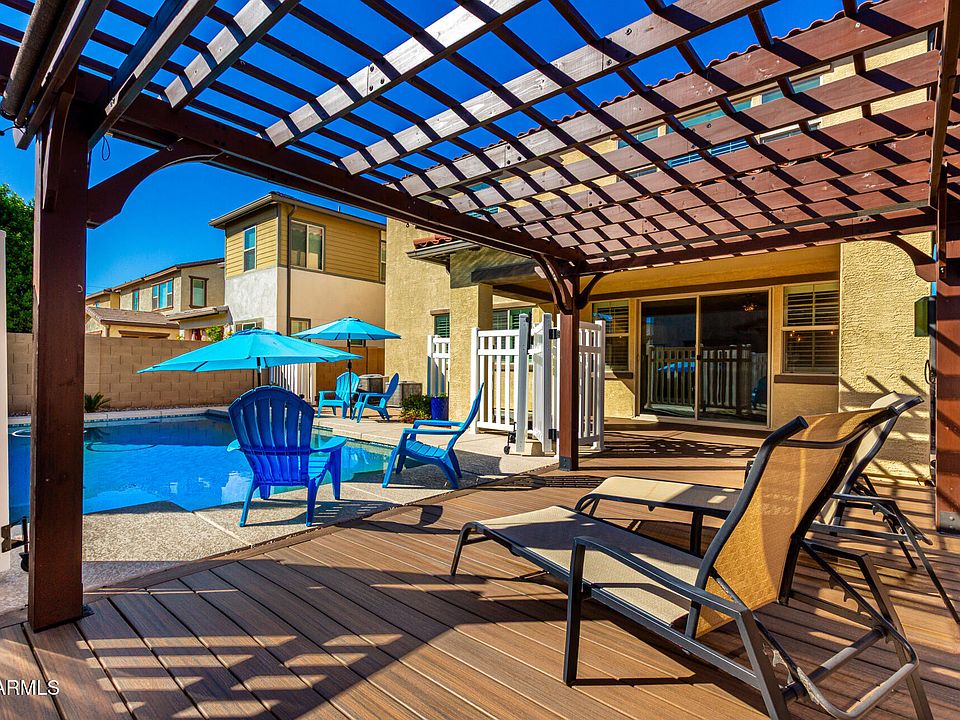 Welcome to the gated community of Encore at North Shore.This move in ready corner lot home has 4 bedrooms (all upstairs) & 3.5 baths.One of the bedrooms is also ensuite with a walk in closet.The main level features an open concept kitchen & living area,large den/office,& half bath.The upgraded island kitchen w/upgraded granite counters,full height backsplash, upgraded gas cooktop & appliances,& huge pantry-perfect for small & large gatherings.Upstairs find 4 bedrooms, 3 full baths, & loft area.The backyard is an oasis with a pool that is both heated & cooled surrounded by custom fencing-opening for entertaining-closing completely for safety.The covered patio & pergola have composite decking material to keep it cool & comfortable.Wood shutters throughout.Located close to downtown Gilbert