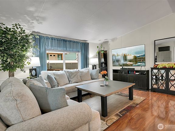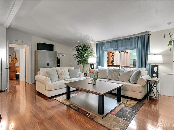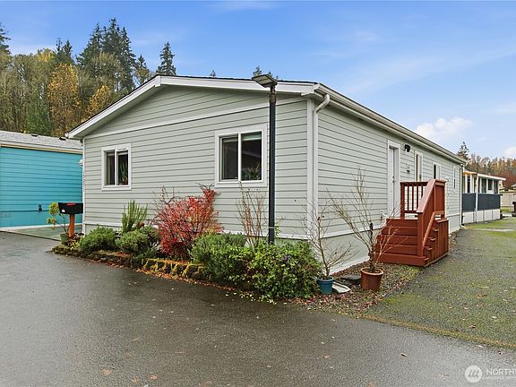 Beautifully remodeled 2020 home in Wonderland Estates 55+ community. Vaulted ceilings, open concept living/dining/kitchen with quartz counters, stainless appliances & new cabinets. Vinyl plank flooring throughout. 3 bed/1.75 bath includes updated bathrooms too. Split floor plan offers privacy with primary suite on opposite side. 3rd bedroom features permitted kitchen—ideal for guests, caregiver or roommate. Double pane windows, hardy plank siding, newer water heater & heat pump w/AC. 2-car carport perfect for parking or outdoor entertaining. Deck with ramp, powered shed, generator-ready. Wired ring camera lighting Low $645/mo lot fee includes garbage. Community clubhouse & RV parking.
