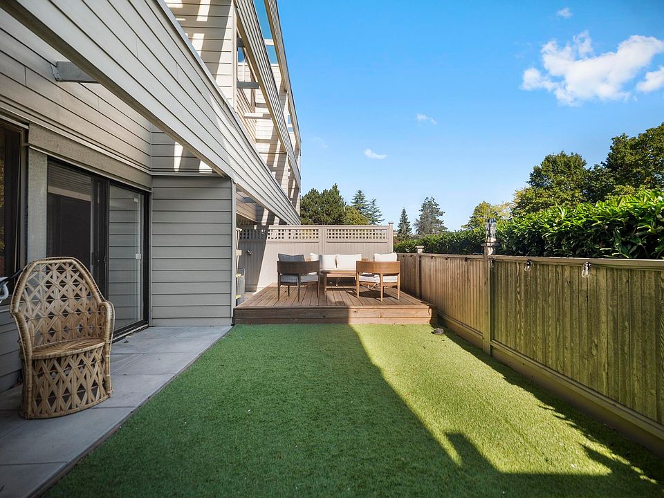 Parkview! Rarely available 2 bed, 2 bath, 906 sq. ft. ground floor unit with 144 sq. ft. enclosed solarium opens to your own south/east private fenced yard, with artificial turf and gate access. This charming ground floor condo offers direct views of a lush park, perfect for morning coffee or evening strolls. Ideal for first time home buyers, families, downsizers, or anyone who loves nature right outside your window. Laminate flooring throughout, designer paint, white kitchen, floor to ceiling windows. Primary Bedroom with walk through closet & 2-piece ensuite. Oversized second bedroom, 4-piece main bath, in suite laundry. Well run strata and building, 1 parking spot, storage locker. OPEN HOUSE CANCELLED