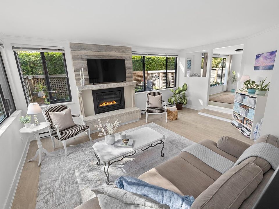 Welcome to Village Terrace, offering a beautifully renovated condo in an amazing location. This bright and open condo features a spacious, updated kitchen with ample storage and an adjoining pantry. The unit offers two generously sized bedrooms with California Closets along with a bonus flex room perfect for a home office. A large laundry room with extra storage adds to the convenience. Enjoy the natural light that floods the main living room from its southwest exposure. This cozy space also includes a new gas fireplace and luxury vinyl plank flooring. Step outside onto your huge, private, and quiet 300sqft patio—perfect for relaxing and entertaining. Located in a prime South Surrey neighborhood, just steps away from restaurants, Bakerview Park, Semiahmoo Shopping Mall and White Rock Beach