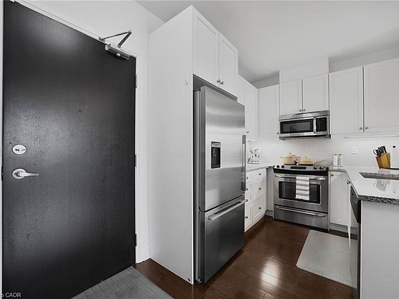 Welcome to this stunning one-bedroom suite, where modern elegance meets everyday comfort in one of Aurora's most sought-after locations. Featuring bright, open-concept living spaces with hardwood floors throughout, designed for both style and functionality. The gourmet kitchen is a true highlight, showcasing quartz countertops, high-end stainless steel appliances, a spacious breakfast bar, and ample cabinetry - perfect for cooking, entertaining, or enjoying a quiet night in. Step outside to your private East-facing balcony with the option to BBQ, the ideal spot for dining al fresco, or unwinding with evening views. Enjoy the convenience of in-suite laundry, a thoughtfully designed layout that maximizes every square foot, and the peace of mind of a well-managed, boutique-style, pet-friendly building. Water softener and smart thermostat included! Premium amenities include a concierge, fitness center, party room, pet wash, bike storage, visitor parking, and more. Perfectly located in Aurora Village, you're just steps to shops, dining, parks,and the Aurora GO Station - everything you need at your doorstep. Move-in ready, beautifully maintained, and rare to find, this is luxury condo living at its finest.