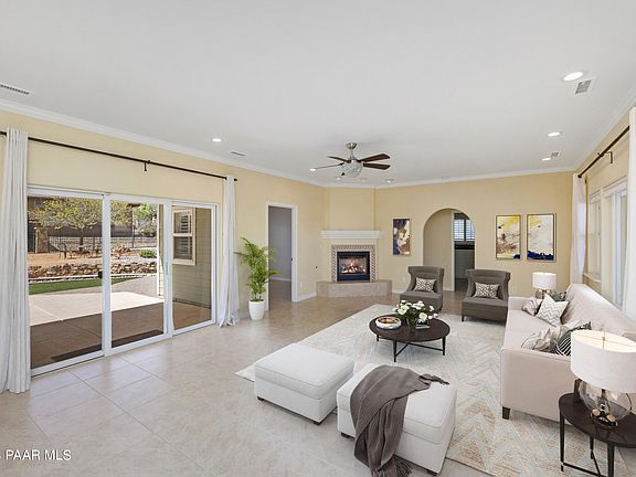 This home is located in the Highly desirable, Gated Neighborhood of Parkside /The Dells At Prescott Lakes. This Bright and open floorplan offers a Cooks Kitchen featuring a large center island, commercial gas range/oven, lots of cabinet storage and plenty of room for your friends and family. The living room opens out to a covered patio and beautifully landscaped back yard. The back yard is fenced and perfect for entertaining. The master suite is spacious, the master bath features dual vanities, a garden tub and snail shower. Lots of windows to bring in Natural light. Cozy gas fireplace in the living room. Three Car Garage with Epoxy flooring and additional storage.