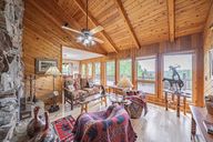 Second wood-burning fireplaceFloor-to-ceiling stone fireplaceModern comfortCustom-built furnitureGame spaceTowering windowsRustic charm