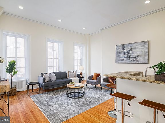 Located in a 1862 Victorian Brownstone this condo combines the elegance and character of a historic building with the ease of condo living. The condo is located on the 2nd floor above the hustle of the street and overlooks the treetops with views of the city and the neighboring historic homes. The condos entry way leads to a charming and light filled living room with large historic windows, a dramatic 11'10" ft ceiling that has original plaster moldings, recessed lighting, and hard wood flooring. The modern kitchen includes a large breakfast bar with a granite countertop that provides a great backdrop for meals and plenty of prep space for cooking. Also, the kitchen has stainless steel GE Profile appliances, a 4 burner gas stove, custom maple cabinets, and a tile floor. In the bedroom, there is a ceiling fan, a closet with custom storage, and an ensuite full bathroom with a tub shower. A convenient stacked washer/dryer is located in the unit as well. For additional items, this unit also comes with a secure storage area in the basement. Enjoy radiator heat and air conditioning from the two mini splits in the condo. The low condo fee includes water and heat, there is no capital contribution, and the building is pet friendly. The location is ideal, with some of Philadelphia’s most popular destinations just steps away... enjoy Rittenhouse Square Farmers' market on the weekend, Walnut Street shops, fantastic restaurants, and walking to theater.