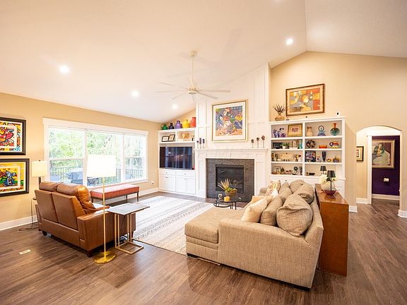 Large islandBeautiful landscapingSurrounded by mature treesWalkout lower levelMultiple outdoor living spacesSpacious primary suiteVaulted ceilings
