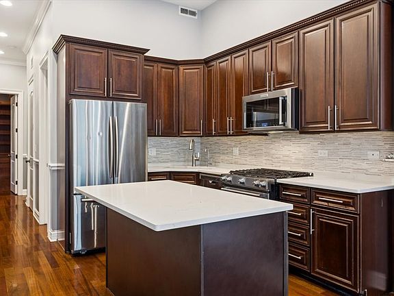 Light-filled 3 bedroom, 2.1 bath home in a prime West Loop location. An open living/dining room showcases a marble-detailed fireplace, crown molding, and bay windows that invite all-day natural light. The kitchen features stainless steel appliances, 42" cabinetry, quartz counters, and an island with breakfast bar seating. Spacious primary suite with dual vanity, deep jetted soaking tub, and separate shower with body sprays. A custom built-in bookcase in the second bedroom creates an ideal study and adds smart storage. Brazilian cherry hardwood floors run through the living spaces, and closets are professionally organized. In-unit laundry (stackable W/D). Attached garage parking INCLUDED. Enjoy a beautifully landscaped common courtyard perfect for entertaining. Unbeatable access to Downtown, expressways, Skinner Park, award-winning West Loop dining, boutiques, and public transit.