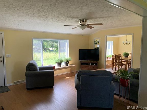 Fabulous One-Floor-Living Home in beautiful country setting just minutes from Houghton/Hancock, Michigan. With est 9.26 acres, this property makes a great Hobby Farm. This property is all set for you. The home has been remodeled for you inside and out. Here is a partial list of the updates made: new metal roof, new cement board siding and window trim, new porch with roof-over, added built-in fireplace, entire interior freshly painted, installed luxury vinyl plank flooring throughout. Need to work from home or want to watch movies on-line?...just connected to UP.Net High-Speed Fiber-Optic Internet. Outside there is a gravel floor pole barn/garage ready for your vehicles, equipment, tools or however you want to use it. For the grow it yourself person, there is a greenhouse. There are vegetable gardens, herb gardens and flower gardens. Fencing around the big garden will protect against hungry deer and leave the harvest for you. There are also newly planted orchards complete with apple, cherry, and apricot trees. Want to raise your own? There is a chicken coup with a pen large enough for them to free-range while providing protection from predators. There is also plenty of space to enjoy the outdoors and wildlife, including the current family of sand-hill cranes. You will love the view and enjoy the quiet when you live here.