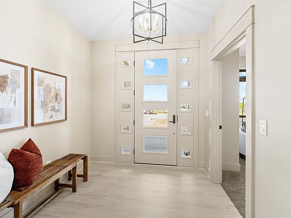 This one-of-a-kind custom home offers a timeless design and top-tier craftsmanship with a spacious layout, zero-step entries, and premium finishes throughout. Highlights include a stunning kitchen with a 9' island & floor to ceiling maple cabinetry, gas stove with custom vent hood, soft close drawers, crown moulding and a butlers pantry. The living room offers a custom entertainment center with shelving & lighting, and 72" fireplace. The luxurious primary bedroom suite has a massive walk in closet, double vanities, walk-in shower w/foot shelf & so much more! 2,035 sq. ft of living space and 1,043 sq. ft in the 3 car garage! Covered patio that extends around the home! 9' ceilings, ICF storm shelter w/ steel door, 2x6 framing and so many more high-end extras!!!! Irrigation and sod to be installed. This home is in the newest development with golf course views and the most amazing sunsets!
