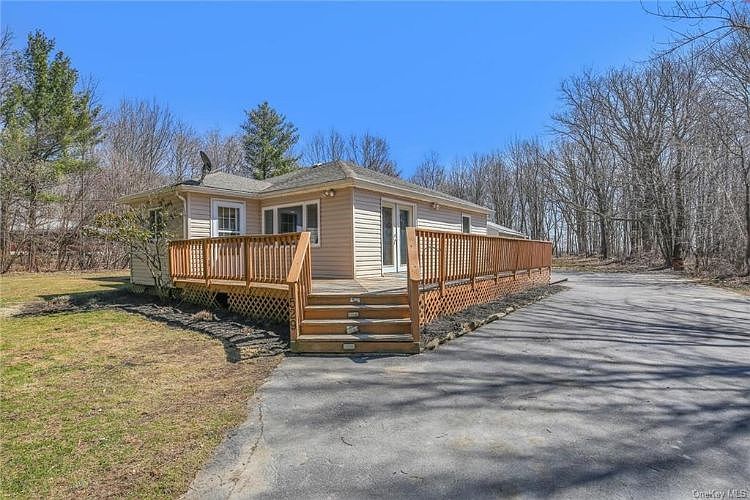Easy Living Ranch home sitting pretty on 2.5 level acres with mature evergreens offering privacy. Relax on the wrap-around porch. Substantial storage in detached 2 car garage. In 2010, most of the house was gutted and 2 new bathrooms installed. New roof and siding in 2010. Master Bedroom has large Walk-In closet and adjoining Master Bathroom. Spacious kitchen has tons of cabinets. Large Living Room and Dining Room combo with easy-maintenance laminate floors. LOW TAXES! Minisink Valley Schools. Easy and quick access to I-84. SOLD AS IS, CONVENTIONAL MORTGAGE OR CASH.
