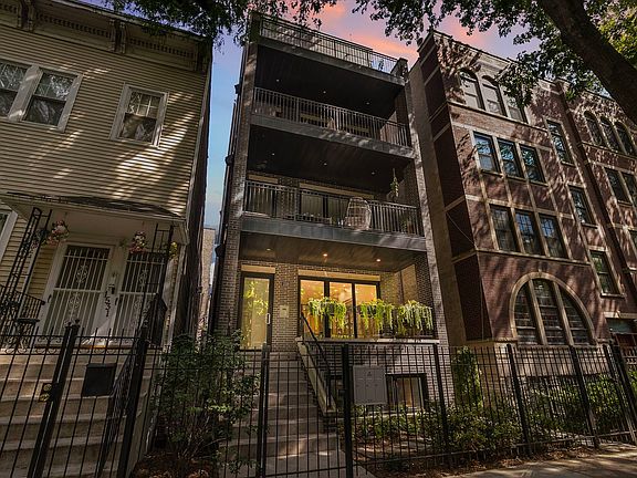 2020 Construction duplex down with exquisite finishes on a tree-lined street. This thoughtfully designed, modern farmhouse-style with 4 bedrooms and 3.5 baths lives like a single family home, featuring ALL bedrooms on same level, 4 private outdoor spaces including garage roof deck equipped with a pergola, 5" inch wide white oak floors with Chevron design in formal living/dining room and natural Walnut wood beams in family room. Deck off formal living room and family room. Kitchen features custom cabinetry, Calacatta quartz counter, honed marble backsplash, Thermador professional series SS appliances, built-in French door refrigerator and beverage center. Seller added a stunning dry bar across from the kitchen in 2025 with two beverage fridges, custom cabinetry, stone counter and mirrored tile. Fireplaces embellished with natural Walnut and quartz surround. White oak banisters and custom millwork including 5" crown and base moldings. Lower level features 4 bedrooms. Luxury baths with natural stone and tile selections. En-suite primary bath with double vanity, quartz counter, shower surround with honed marble and herringbone tile design. Soaking tub, rain head shower and smart thermostatic control. Primary bedroom complete with room-size walk-in closet, and private outdoor patio wrapped in walnut stained natural cedar wood. Brizo and Hansgrohe plumbing fixtures. Radiant heat throughout lower level. Backup battery for the sump pump. 4th bedroom with en-suite bath and natural stone finishes. European style windows. Wired for surround sound. Close to everything including lake front, Lincoln Park, Wells Street, restaurants, shops and cafes and a few blocks to future expansion of the Chicago Park No.598. Very easy public transportation! Deeded Garage Parking included in price, parking spot has an outlet that is directly wired to units electric panel for EV charging.