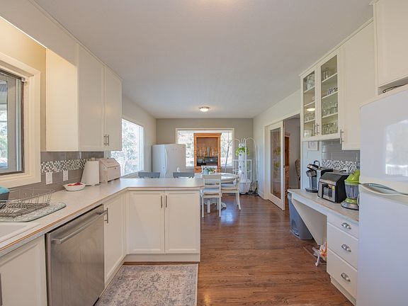 Nestled between Kalamalka Lake and Wood Lake, this stunning 10-acre property offers breathtaking views of both lakes and exceptional privacy in a prime location. The charming level-entry home features restored original hardwood floors throughout. The country-style kitchen includes a tile backsplash and a cozy breakfast nook, while French doors open to a warm and inviting living room with a natural gas fireplace. A formal dining room and convenient main-floor laundry add to the home's functionality. Step outside to enjoy a wraparound deck and a screened-in porch—perfect for relaxing. Upstairs, you'll find two spacious bedrooms and a renovated full bathroom. The lower level offers a separate entrance (or access via the split-level staircase) and is ideal as a suite, complete with an updated kitchen, new flooring, two additional bedrooms, a full bathroom, and its own laundry. There's plenty of storage and ample parking throughout. Equestrian enthusiasts will appreciate the functional horse setup, including a riding arena with lake views, a large barn with a heated tack room, hay storage, and a spacious stall with an outrun. Additional paddocks feature automatic waterers and large lean-to shelters. There's also room to expand for other hobby animals. Surrounded by cherry orchards, the land offers rich soil and excellent potential for planting crops. This is a rare opportunity to own a versatile and picturesque piece of paradise in one of the Okanagan’s most desirable locations.