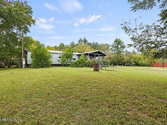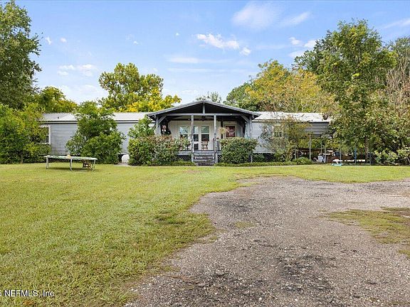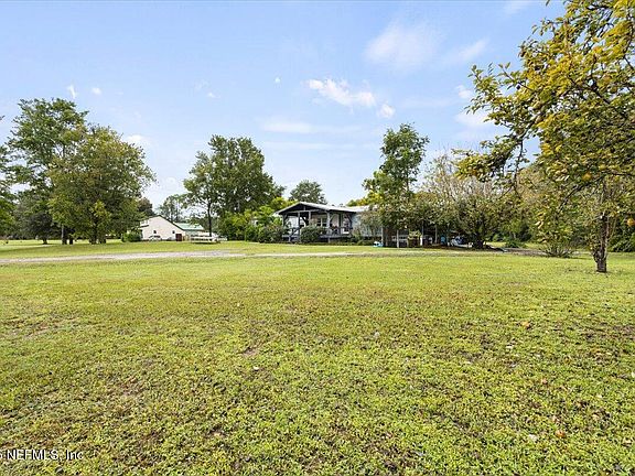 Enjoy 2+ acres of land, free from HOA restrictions, in a serene Jacksonville location that offers the best of both worlds - peaceful country living with easy access to city amenities. Escape the hustle and bustle yet stay connected to everything you need. The spacious double-wide home features a welcoming front porch, split floorplan, and generous living spaces, including a formal living and dining area, office, and family room. The expansive back porch, nearly the length of the home, is perfect for relaxing, with ramps on either side for convenience. There's plenty of room for storage or animals, with a large carport, pole barn, and covered shed. Enjoy the abundance of fresh fruit - figs, mulberries, pear, orange, and lime trees, plus wild blueberries, all on your own land. This is your chance to own some land in NE Florida with room to grow. Come land here!