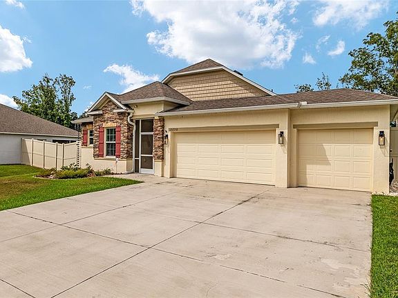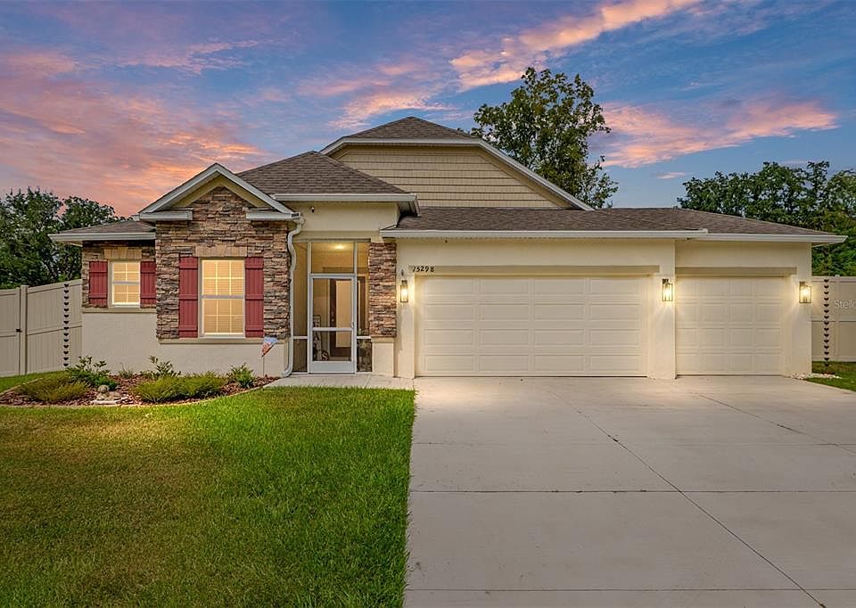 Welcome to this stunning 3-bedroom, 2-bathroom, 2021 Maronda Homes Drexel Model, perfectly situated on an oversized 1-acre lot and offering a true backyard oasis that’s ideal for both relaxing and entertaining. This impeccably maintained home stands out with exceptional curb appeal, featuring rock bed landscaping, a stone-accented front elevation, and a covered, screened-in front entryway that warmly welcomes you in. A spacious 3-car garage provides ample parking and storage, while inside, thoughtful design and high-end finishes create a comfortable, modern living experience. As you enter, the foyer leads to two generously sized secondary bedrooms. The shared second bathroom is beautifully appointed with a 42-inch granite-topped vanity and a glass-enclosed shower/tub combo with tile surround. Down the hallway, you’ll find the expansive owner’s suite, a true retreat featuring a tray ceiling, a custom walk-in closet, and a spa-like en-suite bathroom. Enjoy the garden tub, separate tiled shower with glass door, double granite vanity, and a built-in makeup station—all designed for luxury and convenience. The heart of the home is the open-concept kitchen, equipped with stainless steel appliances, custom cabinetry, a stylish backsplash, and granite countertops throughout. The massive center island offers built-in storage, space for barstools, and designer pendant lighting—perfect for gatherings of any size. Don’t miss the charming coffee bar tucked beside the refrigerator. Overlooking the kitchen is a large great room and dining area, both with triple sliding glass doors that open to a fully tiled, screened-in lanai with doggy door access to the backyard. Additional features include an indoor laundry room conveniently located near the pantry and garage entrance, and tile flooring throughout the entire home for durability and easy maintenance. Step outside to your fully fenced backyard, enclosed with 8-foot vinyl privacy fencing and double gate access. The extended concrete patio spans the entire width of the home—perfect for grilling, entertaining, or simply enjoying the Florida sunshine. As the centerpiece of your private paradise, enjoy a 2021 swim spa with arbor, offering the benefits of a spa and swim exerciser in one. A brand-new grill is also included with the sale, making this home truly move-in ready. Whether you're relaxing in the hammock or hosting family and friends, this home has it all. Don’t miss your opportunity to own this beautifully upgraded, move-in ready home on a rare 1-acre lot with luxury features and a backyard built for making memories. Schedule your private showing today!