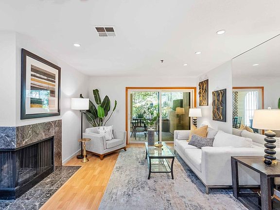 Beautifully remodeled 2 bedroom, 2 bathroom ground floor condominium which offers plenty of privacy within the Palo Alto Central complex with no rental restrictions! Just off California Avenue dining and shops, Farmers Market and close to Caltrain. This rare corner unit includes 3 private patios and plenty of thoughtful custom upgrades and storage throughout. Remodeled kitchen with granite countertops, tiled floors, custom cabinets including pullouts and stainless steel appliances. Primary bedroom suite features custom California Closets closet with drawers, shelves and a beautiful Horchow mirrored jewelry closet. Primary bathroom features a jacuzzi tub, tiled shower and floors. Recessed lighting, dual paned windows, sliding glass doors, laminate floors and custom doors and hardware installed throughout the unit. Nest thermostat. Extra storage closet off of the back patio. Desirable gated complex offers lovely landscaped grounds, fountains, and a pool/spa. Prestigious Palo Alto schools. Secured underground parking.