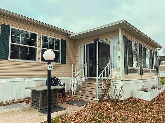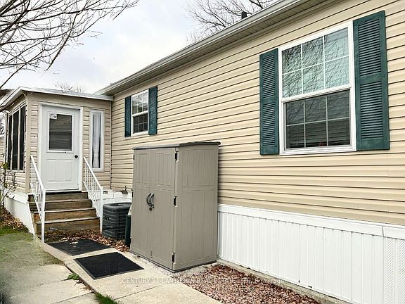 Great opportunity to downsize to this 2 bedroom 2 bathroom modular home with a spectacular view of Lake Ontario and direct access to Pleasant Bay. See realtor remarks for full details of this gated, adult community. This is one of the largest Titan Homes models on ideal lot in Bay Meadows Park, and features loads of windows, high ceilings, open concept living / dining / kitchen; primary bedroom and ensuite 3 piece bathroom at one end, and second bedroom and main 4 piece bathroom at other end. Laundry room is next to mudroom that leads to back yard. 10X10 shed with hydro for extra outdoor storage. Full skirting offers 2 crawl spaces for tires/hoses etc. The sunroom has lots of natural sunlight and a clear view across fields to water. Private driveway with parking for 2 vehicles. You'll enjoy the social evenings at rec centre, meeting people at the saltwater pool, or bonfires down by Pleasant Bay.