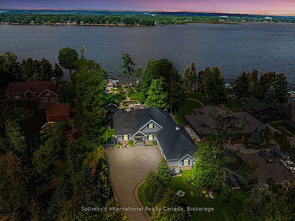 Curated with pure intention, exceptionally executed - here's a spectacular opportunity to own one of Lake Simcoe's most admirable waterfront estates! This custom-built residence offers over 6,000 sq ft of refined living space on 1.2 acres of professionally landscaped grounds. With 107 feet of prime WESTERN shoreline, the property is perfectly positioned for unforgettable sunsets and an unmatched lakeside lifestyle. Crafted by award-winning West Brennen Construction, the home blends timeless elegance with modern performance. Solid 8' walnut doors and flooring, intricate plaster and imported tin ceiling details, natural quartzite, granite, and leathered granite surfaces create a sense of warmth, sophistication, and enduring quality. The layout features four spacious bedrooms, a dedicated office, and five impeccably designed bathrooms, including a spa-like primary ensuite featured in House & Home magazine. The walk-out lower level offers 9.5' ceilings, a custom media room, a games area, and an English-style pub with cherry wood millwork, marble floors, and granite counters, the ultimate entertaining space. Smart home technology controls lighting, irrigation, and security, while premium mechanical systems, including 400-amp service and a 30KW Generac generator, provide year-round comfort and reliability. Outside, park-inspired landscaping surrounds an outdoor kitchen, waterfall feature, and a charming gazebo ready for a hot tub or lakeside lounging. The heated four-car garage with Rhino-coated floors and custom storage adds practicality to luxury. At the waters edge, a rare dry boathouse with finished space above offers excellent flexibility ideal for guests, a studio, or office, while two marine railways, deep water access, and twin 40' docks easily accommodate a 28' boat and Seadoos. With flawless craftsmanship, modern functionality, and an unbeatable waterfront setting, this property offers a truly elevated lifestyle where every detail has been thoughtfully executed.